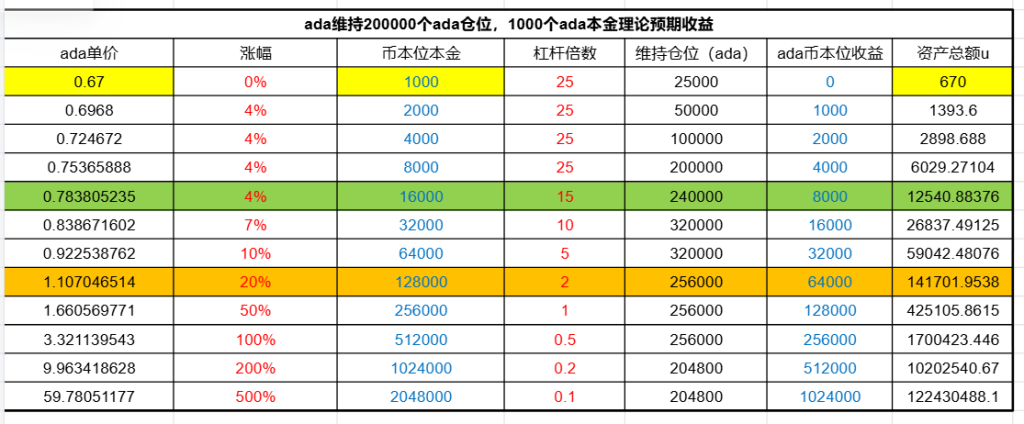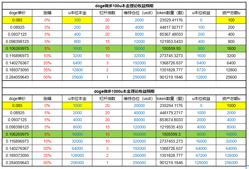他这个表格改了一下杠杆倍数,差不多16%的涨幅,600u就可以有11000u了,有20倍的涨幅了。
