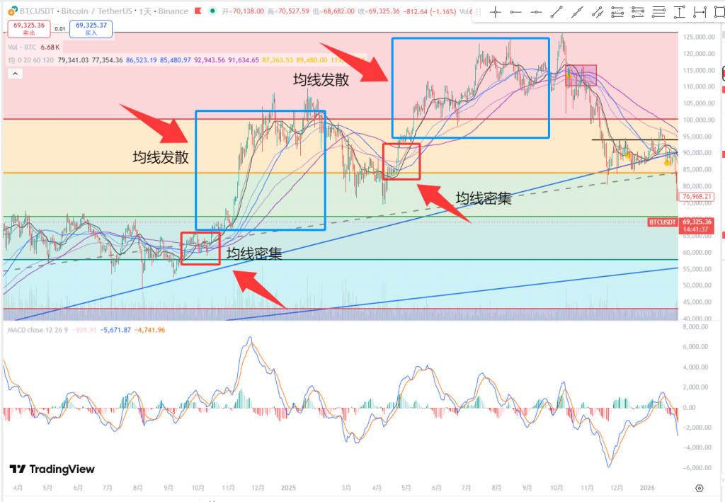 ①均线密集就是全部的线聚集到一起了,分不清哪个在上面哪个在下面了,