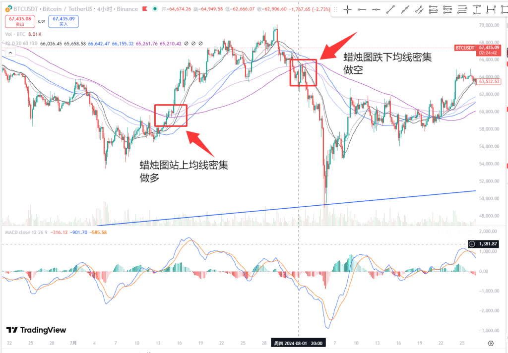 当均线密集的时候,蜡烛图站上均线之上,而且回踩不破均线,就可以开多。