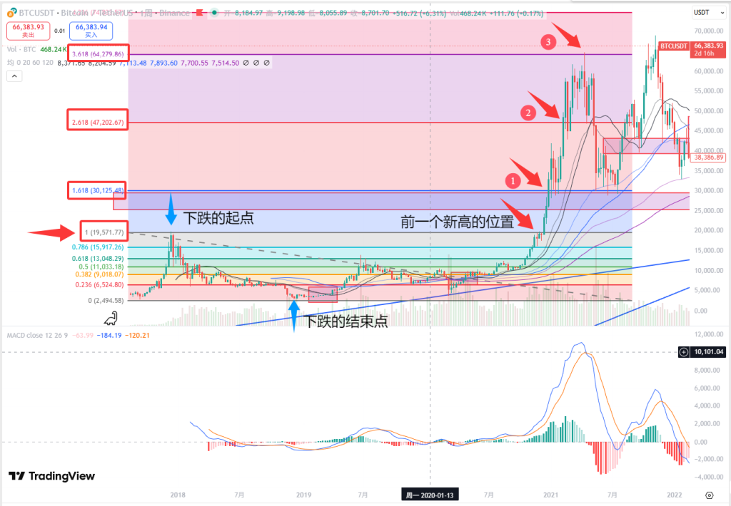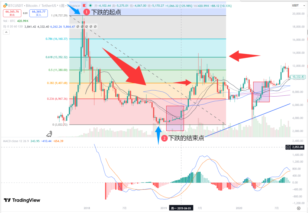 就可以在周线和月线去使用斐波那契回撤,去判断大的主要方向。